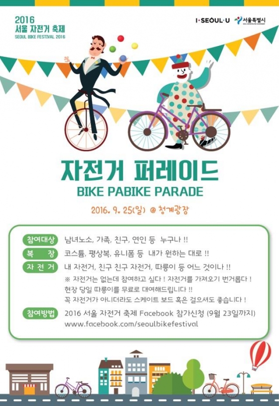 서울시는 24~26일 3일간 서울광장과 청계광장 일대에서 '2016 서울 자전거 축제(SEOUL BIKE FESTIVAL 2016)'를 개최한다고 22일 밝혔다.